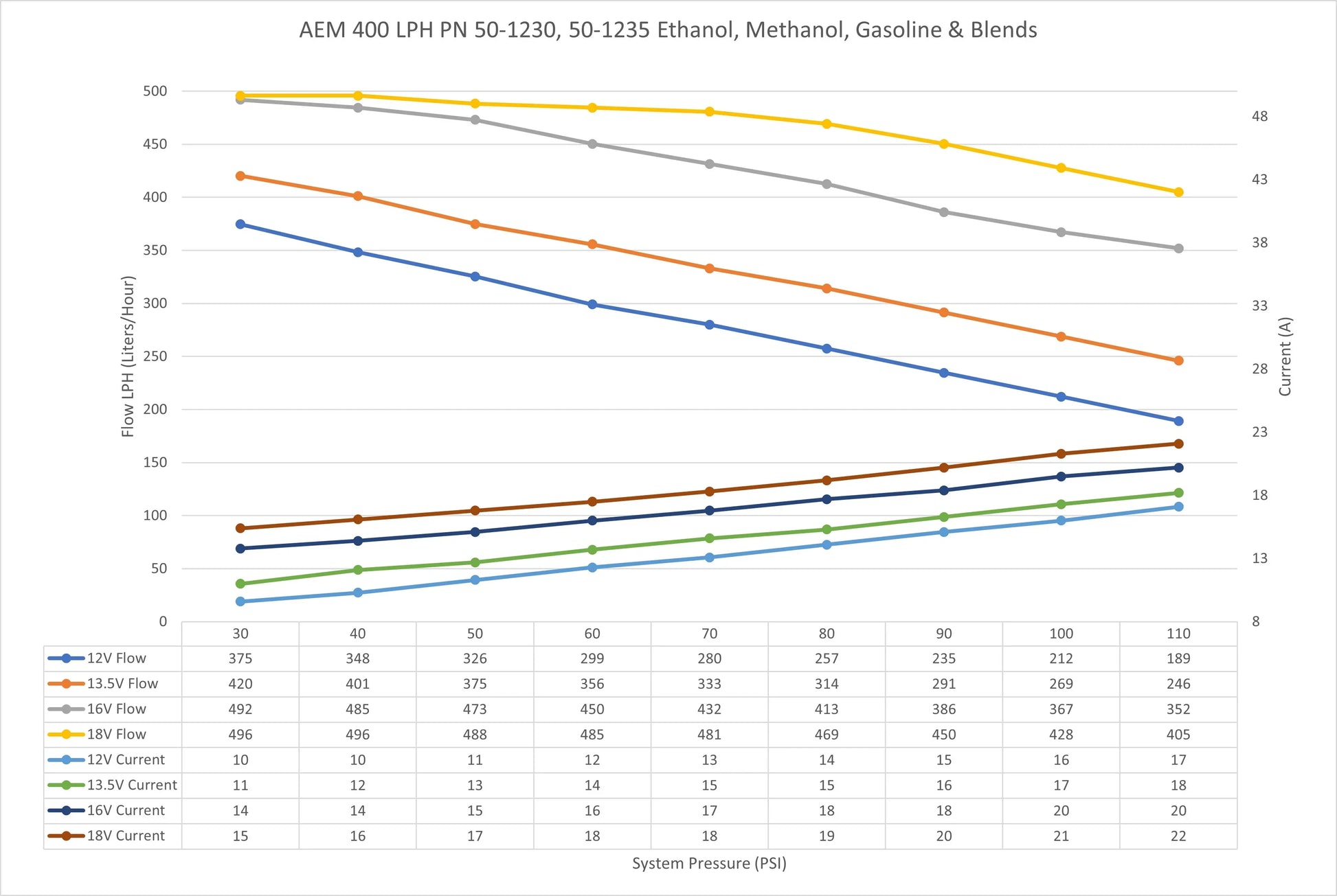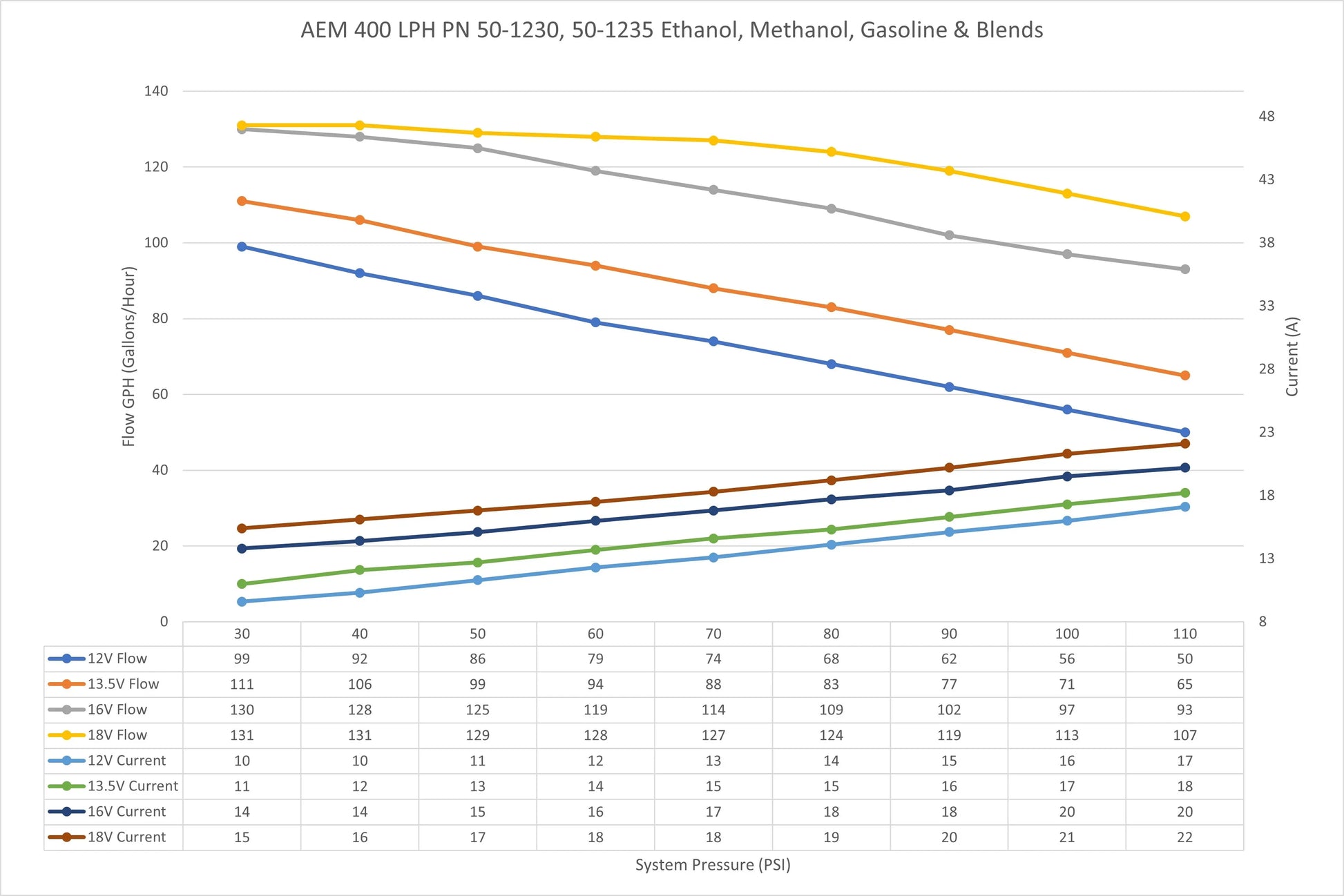 Each pump is individually flow tested and guaranteed to flow 400+ LPH (106 GPH) at 40 PSI (13.5V), which on gasoline will support 1000+ horsepower!* The pumps also maintain their high flowrate even as system pressure increases flowing 330+ LPH at 70 PSI (13.5V) which will support approx. 870 HP* on gasoline! Please see the flow curves and current draw vs. fuel pressure graphs on the specs tab for more information. With their compact 39mm body (same size as Walbro 255), low amperage draw,