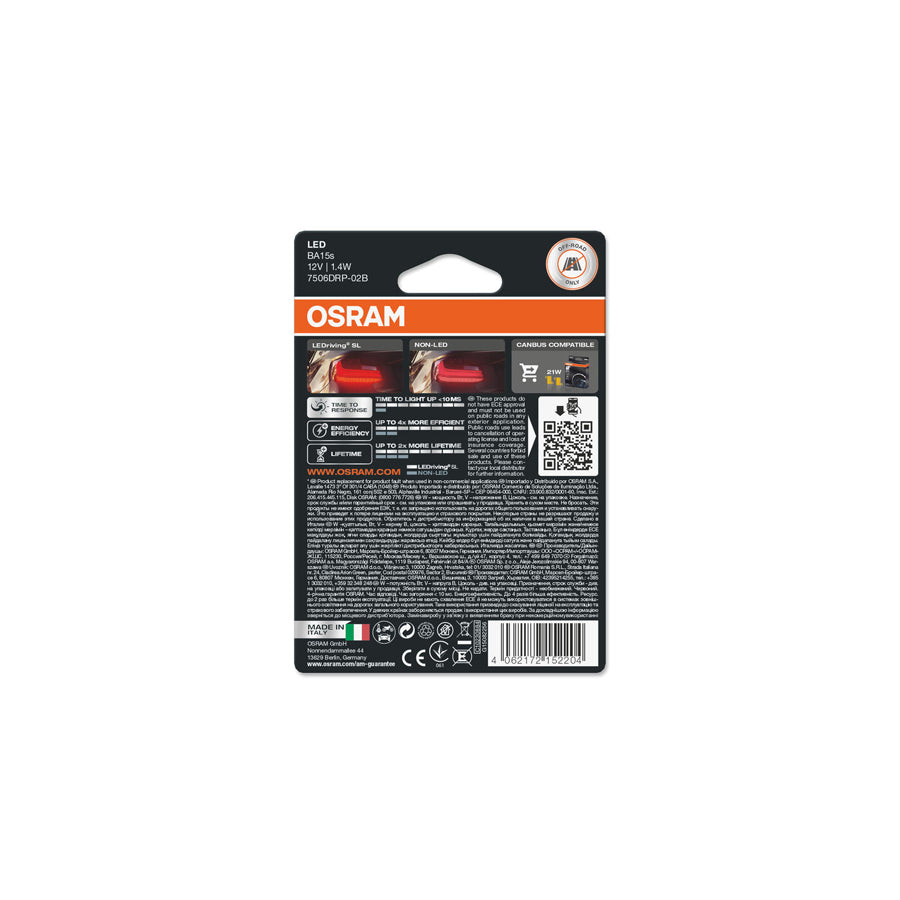 This is Osram LED P21W Red Brake Light Bulbs 12v 1.4W BA15s (382 21W) 7506DRP-02B.